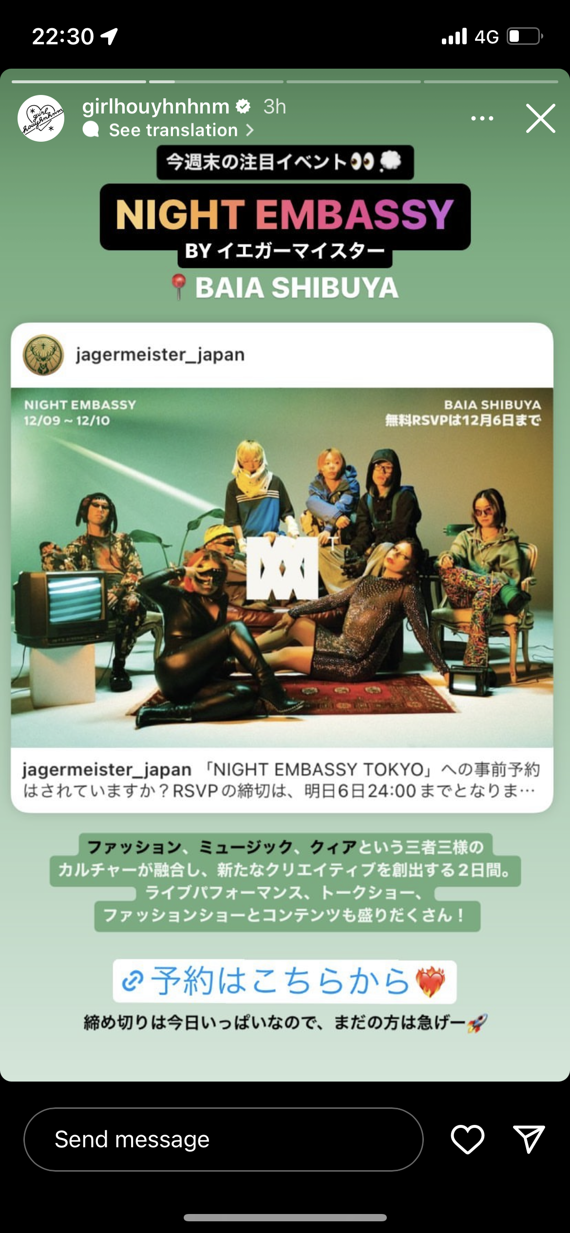 Night Embassy Tokyo's music segment, led by rapper KZM, showcased the city's dynamic and experimental sound scene. This portion of the event featured live performances from a diverse range of artists, highlighting Tokyo's underground music community and emerging genres. By integrating music with fashion and queer culture, the project emphasized the interconnectedness of these creative scenes in Tokyo's nightlife. The music program included everything from avant-garde electronic sets to hip-hop performances, reflecting the city's eclectic musical landscape. This platform not only celebrated local talent but also positioned Tokyo as a hub for innovative and boundary-pushing sound, aligning with Jägermeister's vision of supporting progressive cultural expressions.